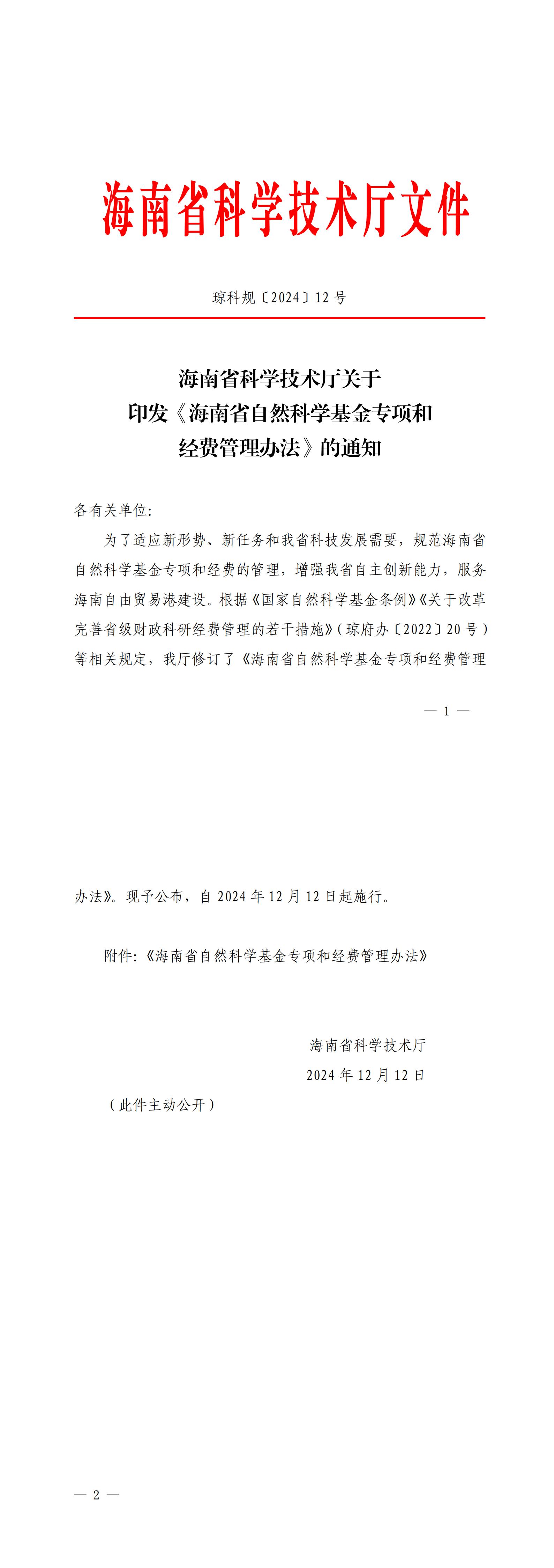 海南省科学技术厅关于印发《海南省自然科学基金专项和经费管理办法》的通知(琼科规〔2024〕12号)
