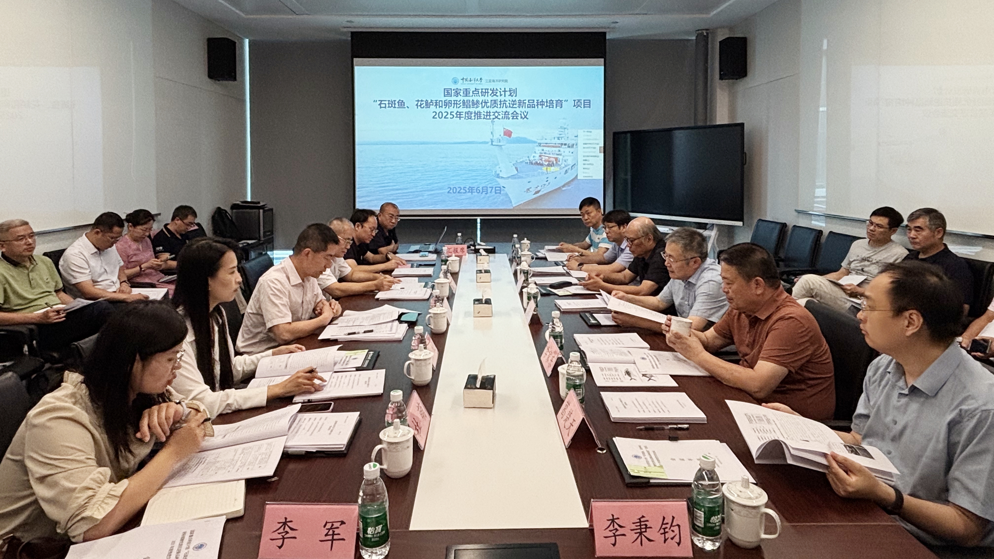 2025年6月7日,国家重点研发计划“石斑鱼、花鲈和卵形鲳鲹优质抗逆新品种培育”项目2025年度推进会在三亚召开。农业农村部科技发展中心熊炜处长、海南省科学技术厅林槟副处长、中国海洋大学三亚海洋研究院执行院长何鑫及项目研究团队成员等参加会议。中国海洋大学包振民院士、上海海洋大学李家乐教授、中国水产科学研究院黄海水产研究所庄志猛研究员等8位咨询专家组成员莅临指导。