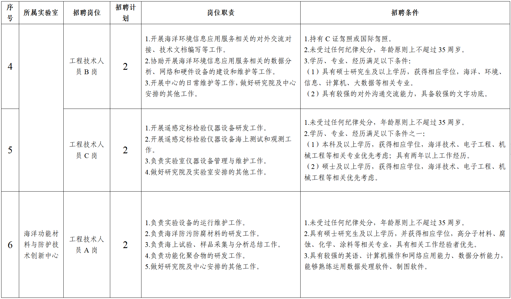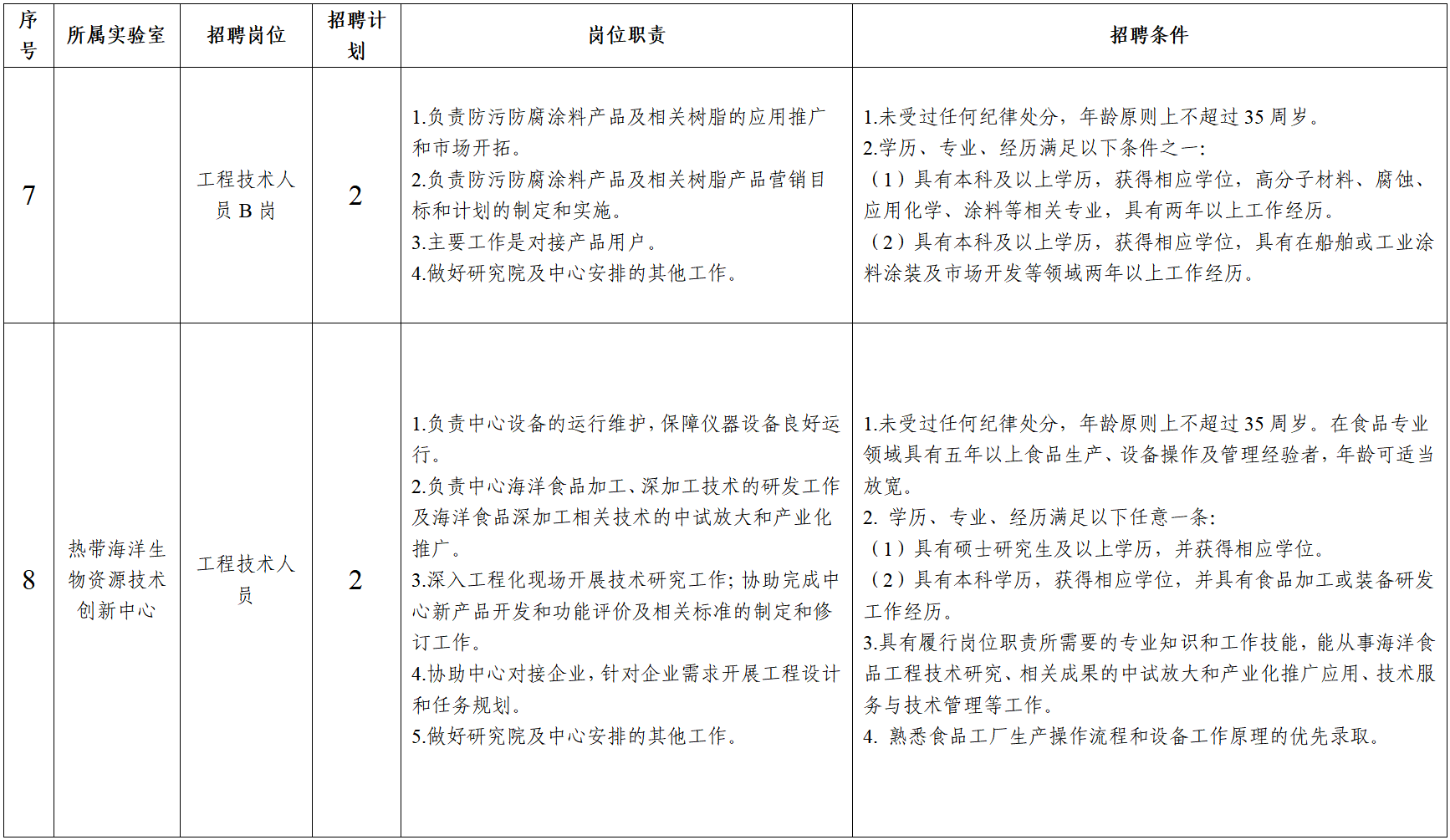 本次招聘16名工程技术人员,其中,热带海洋生物种质资源开发与种业工程实验室(海南省热带水产种质重点实验室)4名;深远海立体观测与信息服务中心(海南省海洋立体观测与信息重点实验室)6名;海洋功能材料与防护技术创新中心4名;热带海洋生物资源技术创新中心2名。