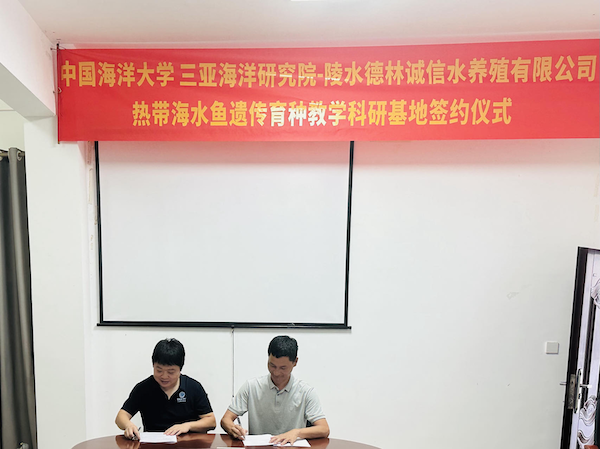 随后,邵长江院长和刘德林总经理共同签署《中国海洋大学三亚海洋研究院 陵水德林诚信水产养殖有限公司合作协议》,胡景杰副院长和刘德林总经理共同为热带海水鱼遗传育种教学科研基地揭牌。