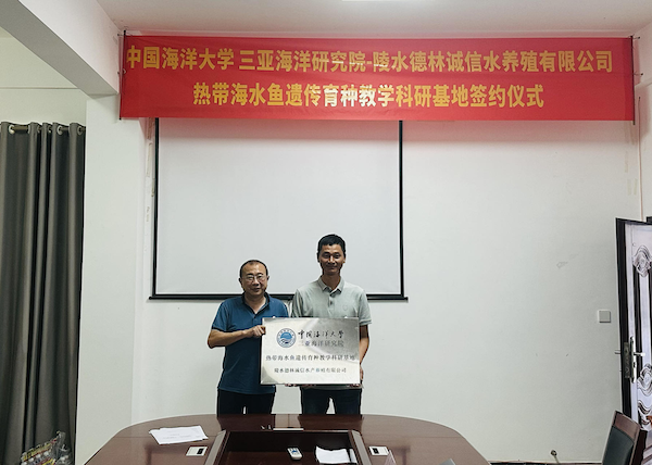 2023年6月8日,中国海洋大学三亚海洋研究院与陵水德林诚信水产养殖有限公司合作协议签约仪式在陵水德林诚信水产养殖有限公司举行。研究院执行院长邵长江、副院长胡景杰,陵水德林诚信水产养殖有限公司总经理刘德林、技术总监林川等出席签约仪式并座谈。